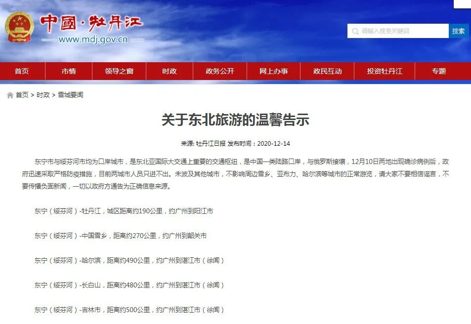 告知指出:东宁市与绥芬河市均为口岸城市,是东北亚国际大交通上重要的交通枢纽,是中国一类陆路口岸,与俄罗斯接壤,12月10日两地出现确诊病例后,政府迅速采取严格防疫措施,目前两城市人员只进不出。未波及其他城市,不影响周边雪乡、亚布力、哈尔滨等城市的正常游览,请大家不要相信谣言,不要传播负面新闻,一切以政府方通告为正确信息来源。