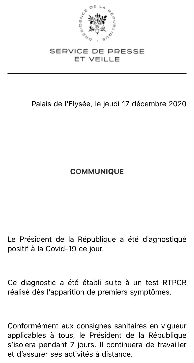 当地时间17日上午,据法国总统府爱丽舍宫发布的公告,法国总统马克龙当日得知其新冠病毒核酸检测结果呈阳性。公告称,马克龙是因为出现了初步的症状而接受检测的。