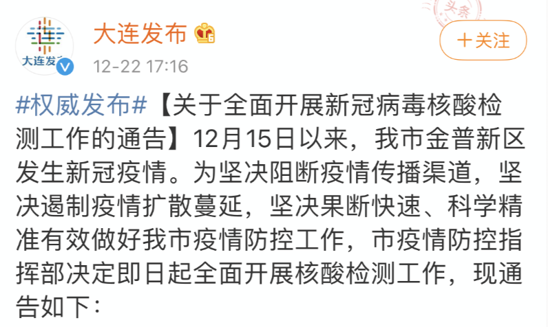 今天(22日),据@大连发布消息,12月15日以来,辽宁大连市金普新区发生新冠疫情,大连市疫情防控指挥部决定即日起全面开展核酸检测工作。