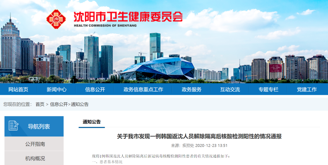 今天(23日)下午,辽宁沈阳卫健委官网发布《关于我市发现一例韩国返沈人员解除隔离后核酸检测阳性的情况通报》。
