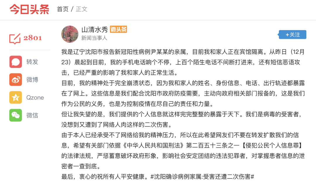 12月24日午时,沈阳新冠确诊者尹某某的另一名密接者在网络上发声。他撰文写道,从23日起不断接到陌生电话和恶语攻击的短信。由于他和家长的个人信息都被暴露在网上,“目前,我的精神处于完全崩溃状态。”