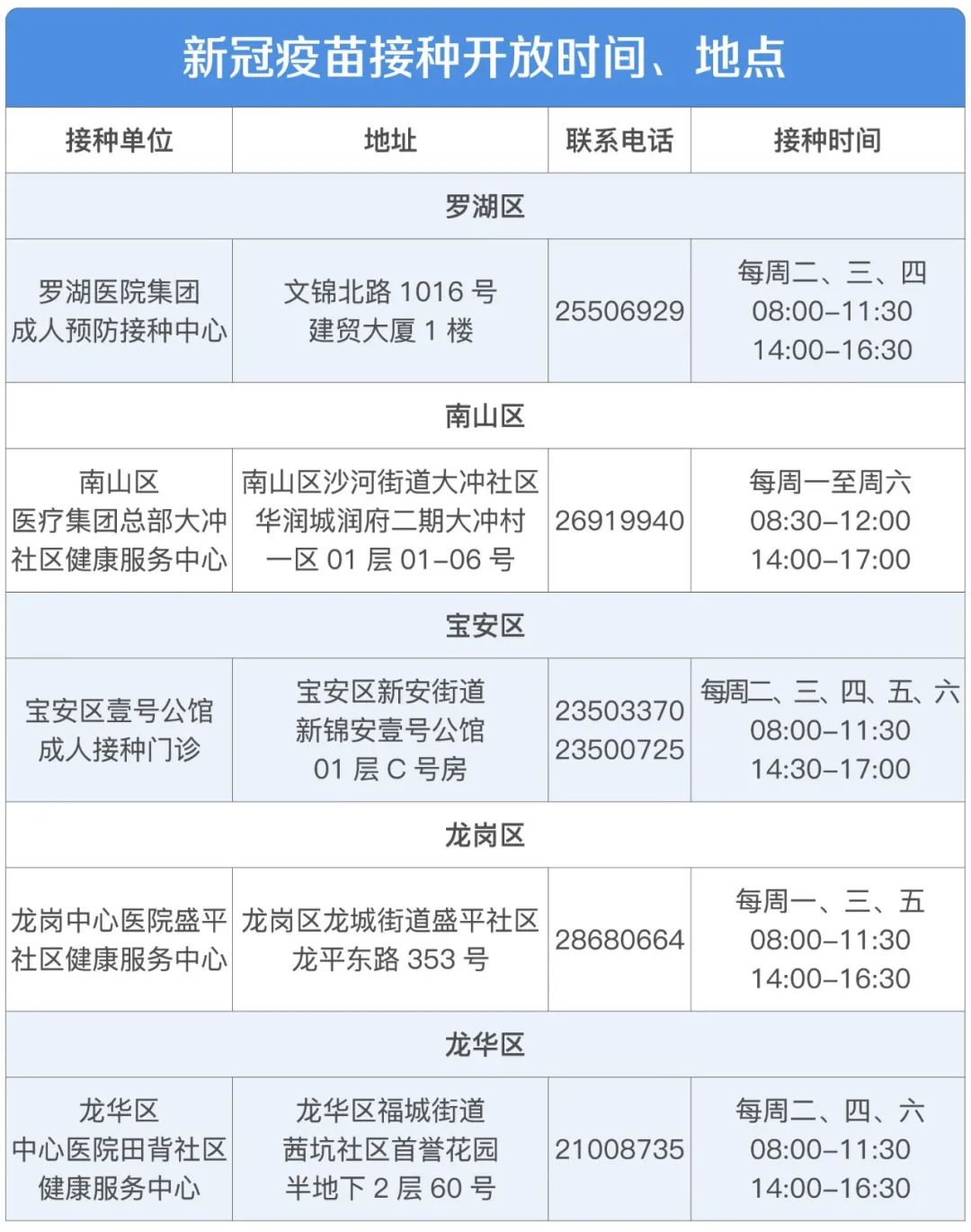 目前,深圳罗湖、南山、宝安、龙岗、龙华区共有5家社康中心开放接种。