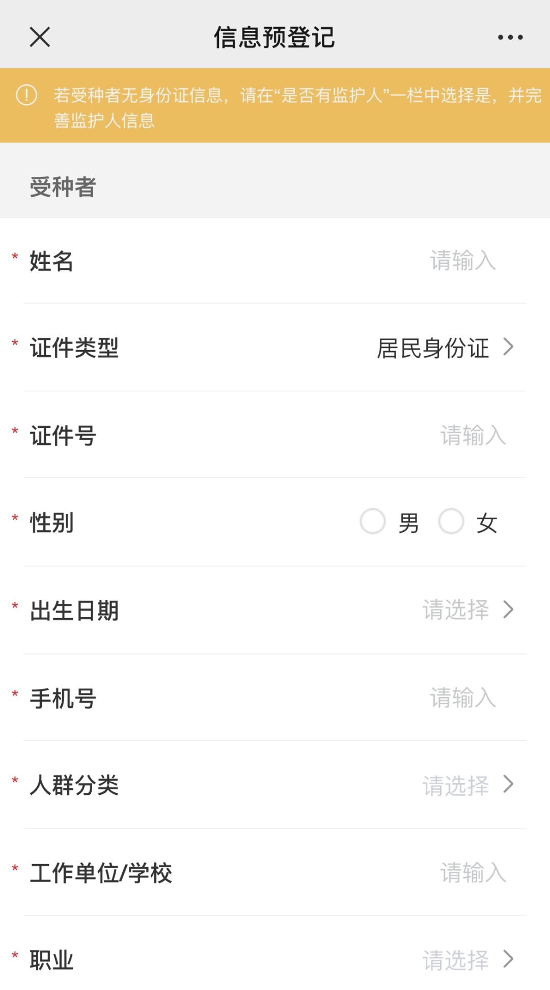温馨提示:疫苗名称默认新冠疫苗,受种者默认为建档填写的用户信息,2者不可修改。