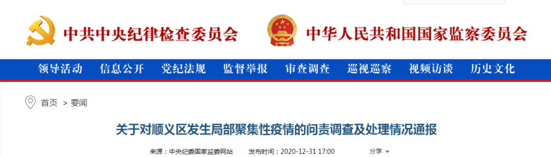 今天(31日)下午5时,中央纪委国家监委网站发布《关于对顺义区发生局部聚集性疫情的问责调查及处理情况通报》。