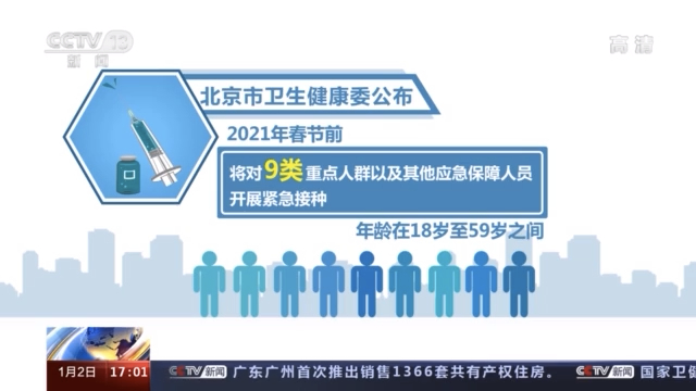 北京市卫生健康委公布,2021年春节前,将对9类重点人群以及其他应急保障人员开展紧急接种,年龄在18岁至59岁之间。