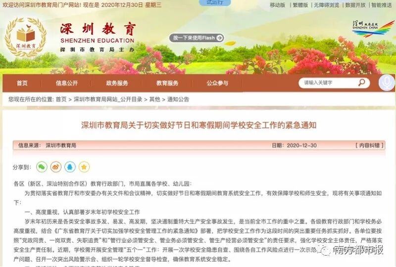 2020年12月30日,深圳市教育局在官网发布《关于做好全市中小学幼儿园假期工作安排的通知》(下简称《通知》),根据通知: