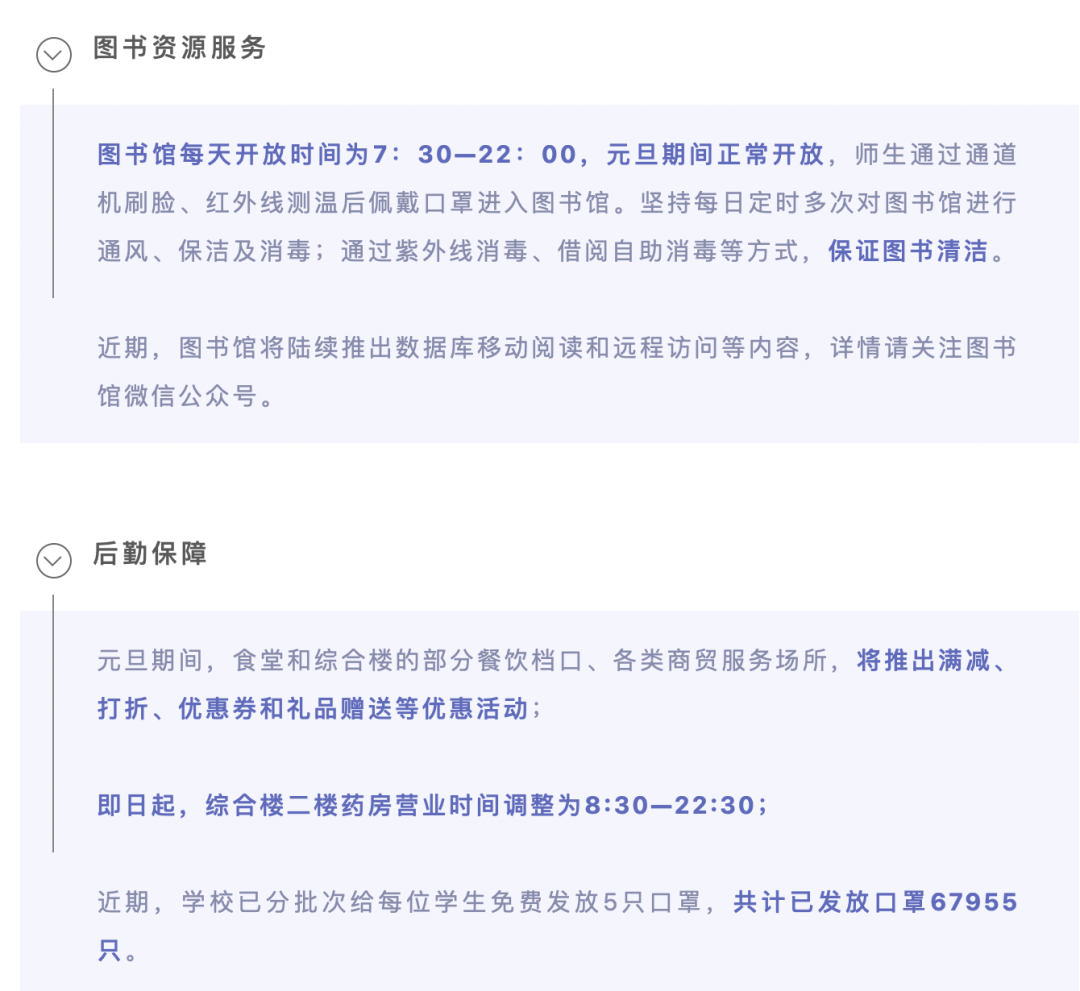在大连海事大学,学校将承担同学们因放假时间调整而产生的退票费、改签费,提升校园网络质量。元旦期间,学校还为全体学生准备了总价值40万元就餐抵值券和2万套果盒,向大家送去新年的慰问和祝福。