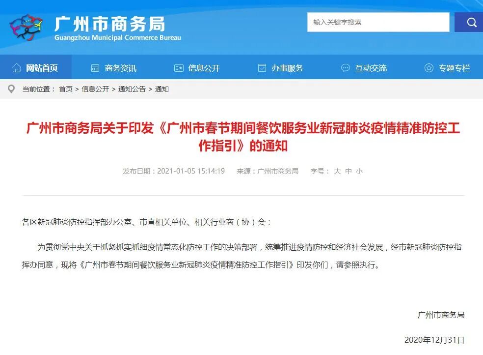 广州市商务局在官网发布《广州市春节期间餐饮服务业新冠肺炎疫情精准防控工作指引》。