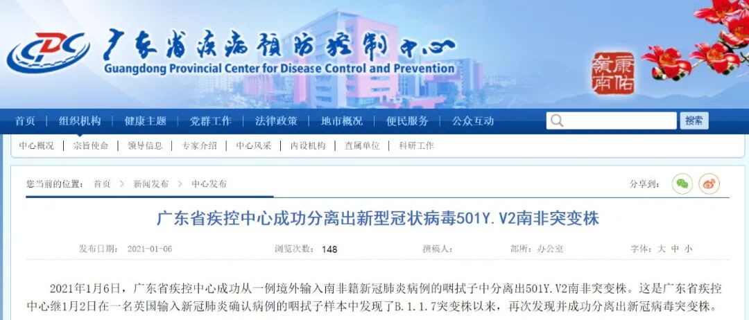昨天(2021年1月6日),广东省疾控中心成功从一例境外输入南非籍新冠肺炎病例的咽拭子中分离出501Y.V2南非突变株。这是广东省疾控中心继1月2日在一名英国输入新冠肺炎确认病例的咽拭子样本中发现了B.1.1.7突变株以来,再次发现并成功分离出新冠病毒突变株。