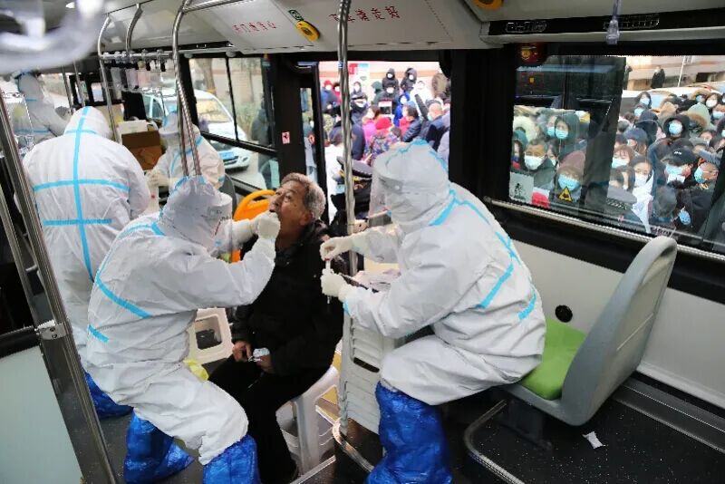 1月7日,医护人员在“核酸采样流动车”内为市民进行核酸采样。图据新华社