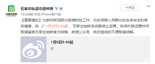 为做好新冠肺炎疫情防控工作,切实保障人民群众的生命安全和身体健康,自1月9日9:40起,石家庄地铁各线路停止运营。后续恢复运营时间敬请留意石家庄地铁官方微博、微信公众号。
