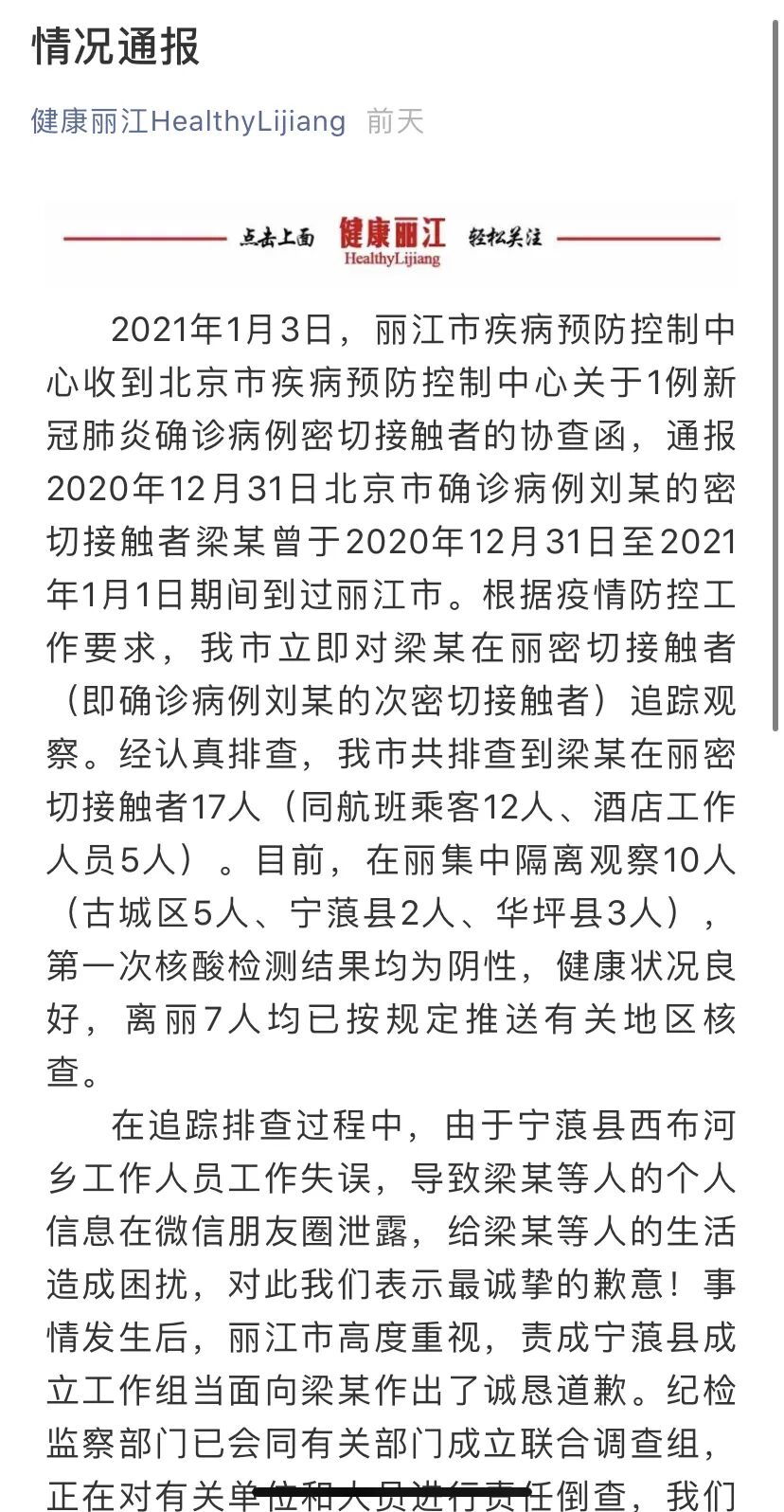 通报称,2021年1月3日,丽江市疾病预防控制中心收到北京市疾病预防控制中心关于1例新冠肺炎确诊病例密切接触者的协查函,通报2020年12月31日北京市确诊病例刘某的密切接触者梁某曾于2020年12月31日至2021年1月1日期间到过丽江市。
