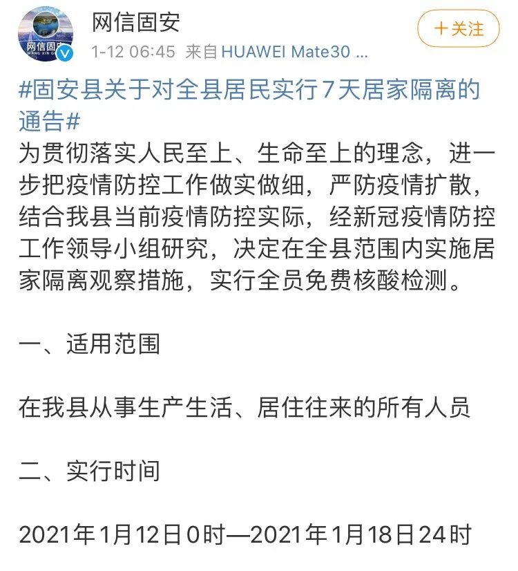 据@网信固安 消息,为贯彻落实人民至上、生命至上的理念,进一步把疫情防控工作做实做细,严防疫情扩散,结合河北固安当前疫情防控实际,经新冠疫情防控工作领导小组研究,决定在固安全县范围内实施居家隔离观察措施,实行全员免费核酸检测。