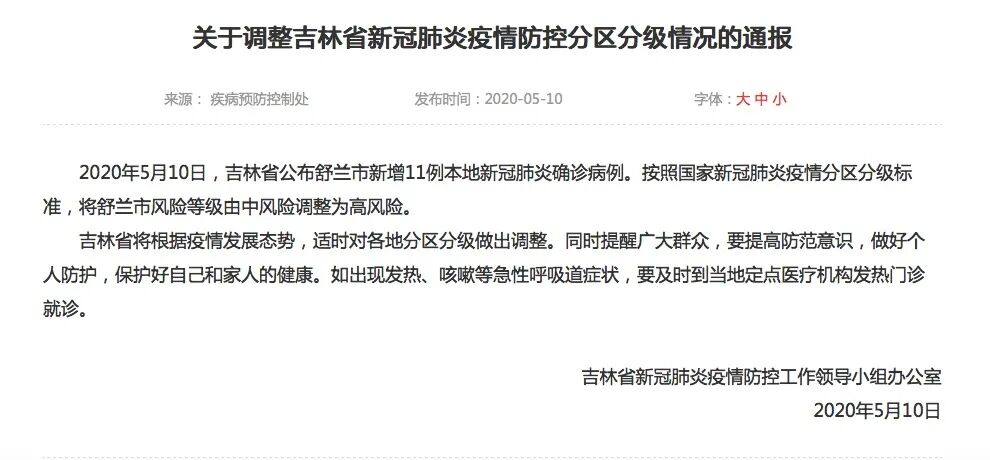 5月10日,舒兰市风险等级由中风险调整为高风险。