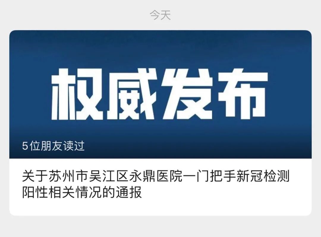 今日(25日),苏州吴江区政府微信发布平台“苏州吴江发布”发布“关于苏州市吴江区永鼎医院一门把手新冠检测阳性相关情况的通报”。