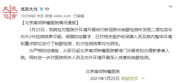 今日(25日),北京大兴区官方微博@北京大兴发布一则“北京南郊肿瘤医院情况通报”。