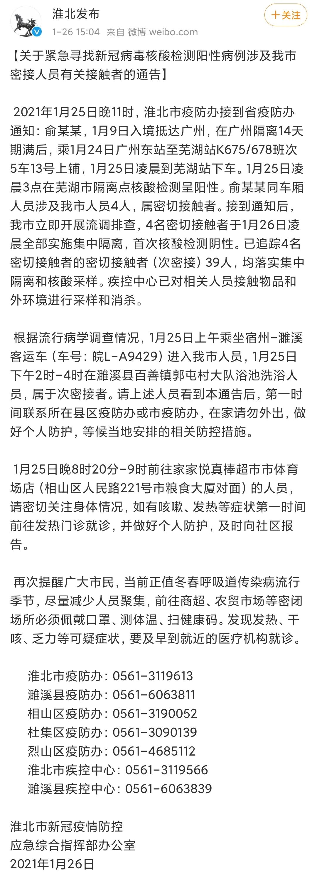 根据淮北发布公布的信息,2021年1月25日晚11时,淮北市疫防办接到省疫防办通知:俞某某,1月9日入境抵达广州,在广州隔离14天期满后,乘1月24日广州东站至芜湖站K675/678班次5车13号上铺,1月25日凌晨到芜湖站下车。
