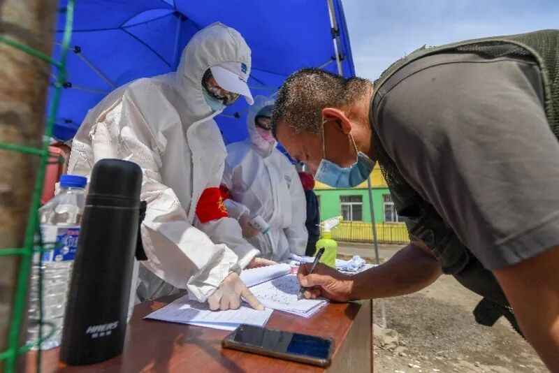 5月11日,在吉林省舒兰市一小区,进出居民在登记体温等信息。新华社发