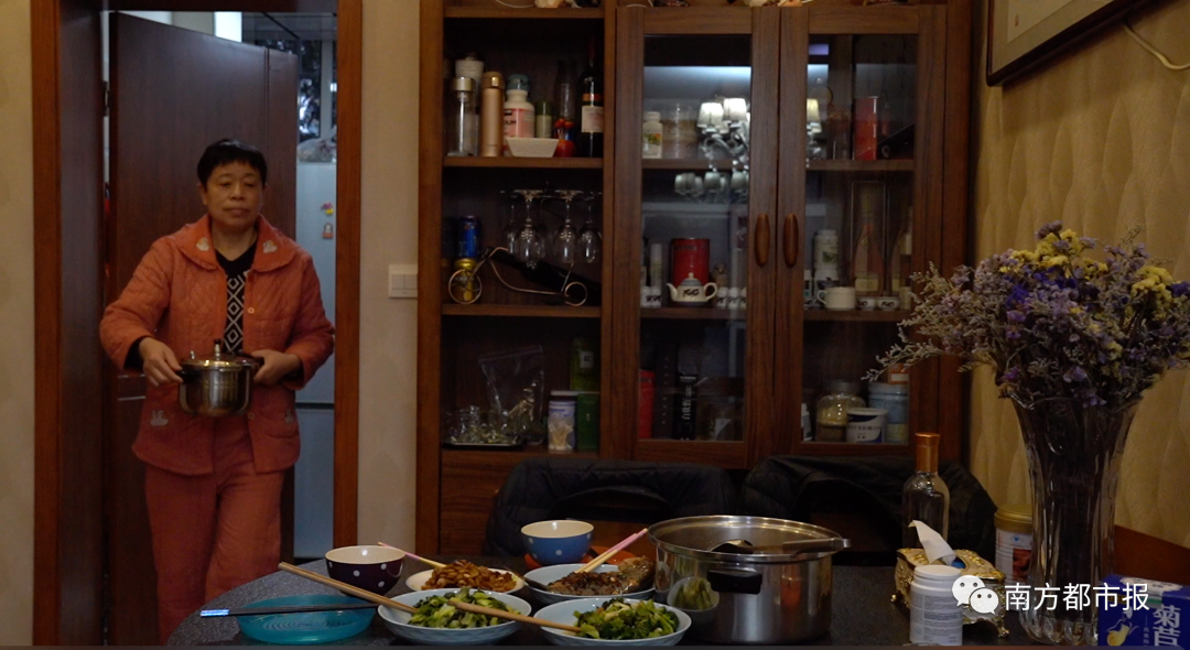 开饭时间,周德彬在每个盘子里摆一双筷子,即使每天只有夫妻两人吃饭,他们也坚持使用公筷。家中储物柜里囤积着七八百个口罩,还有各种感冒药品。