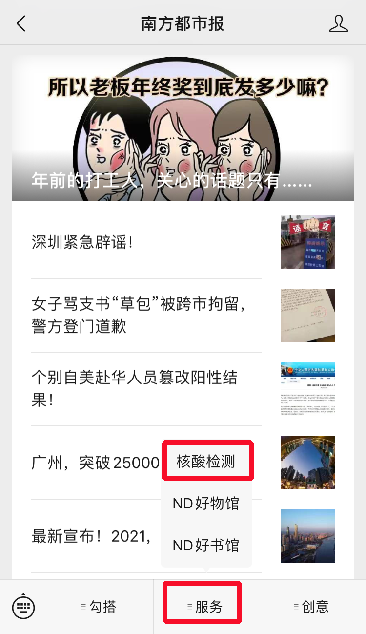 长按识别下方二维码,进入“南方都市报”微信公众号,点击菜单“服务”-“核酸检测”进入广东省新冠检测服务平台。