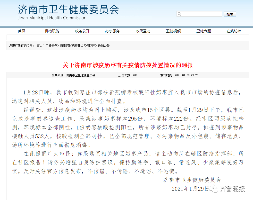 29日,济南市卫健委发布通报,涉疫奶枣涉及济南市15个区县,均为网上购买。