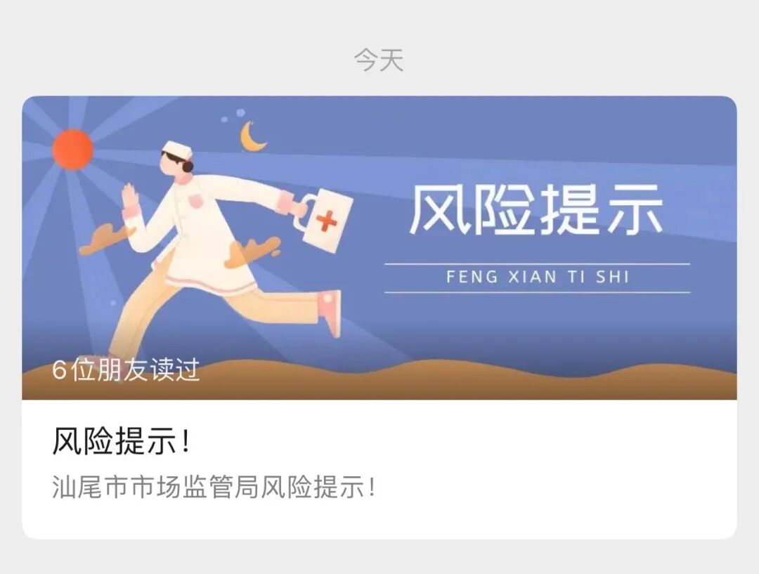 昨日(1月31日),广东汕尾市市场监督管理局微信公众号“汕尾市场监管”发布一则“风险提示”。