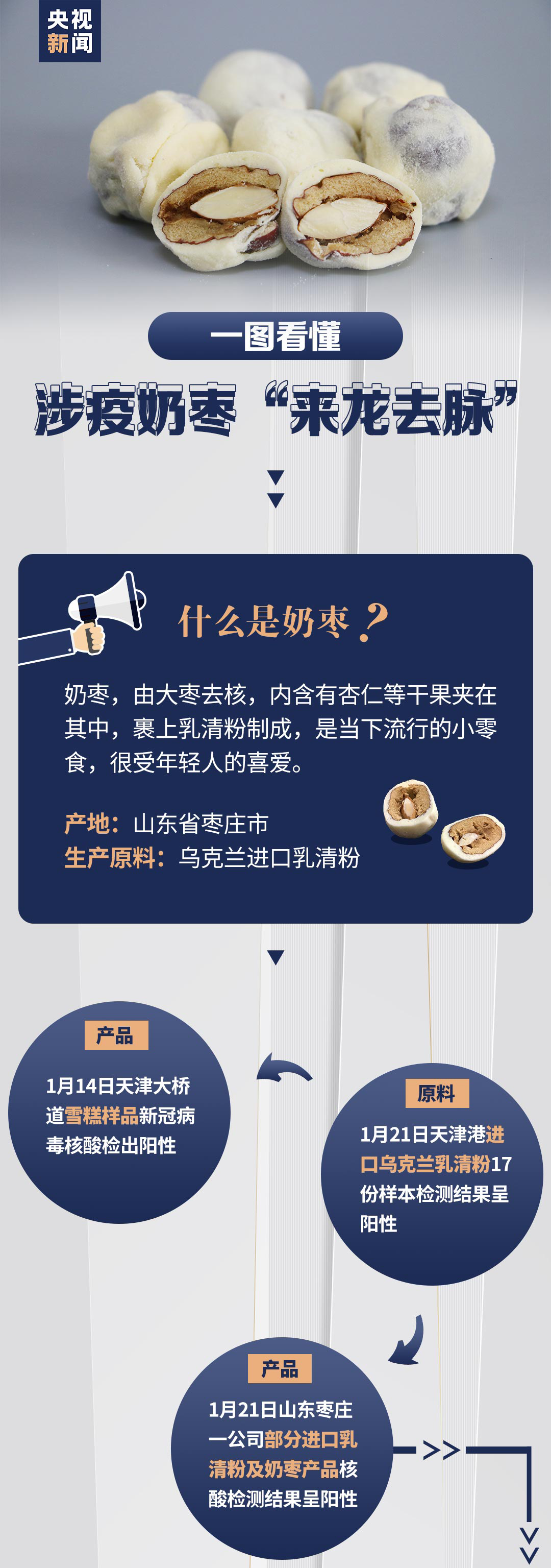 昨日,山东枣庄通报涉疫“奶枣”处置有关情况。经查,涉事企业从天津港购入进口的乌克兰产乳清粉10吨,用于生产“奶枣”产品。经对涉事公司厂区环境、厂外仓库外环境、涉疫乳清粉及外包装、“奶枣”产品(半成品、成品)及外包装和线下经销商库存成品、环境等抽取样本 460 份,经核酸检测阳性样本 64 份。