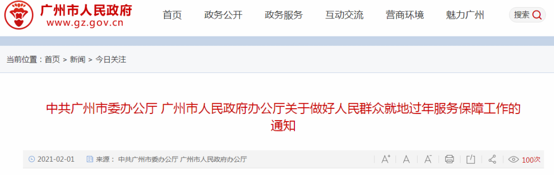 昨天(1月31日),中共广州市委办公厅、广州市人民政府办公厅发布《关于做好人民群众就地过年服务保障工作的通知》,要求各区、各单位要做好组织引导和政策解释,倡导群众就地过年,非必要不出行,确需出行人员原则上不前往境外和国内中高风险地区,当好“疫情防控第一责任人”。