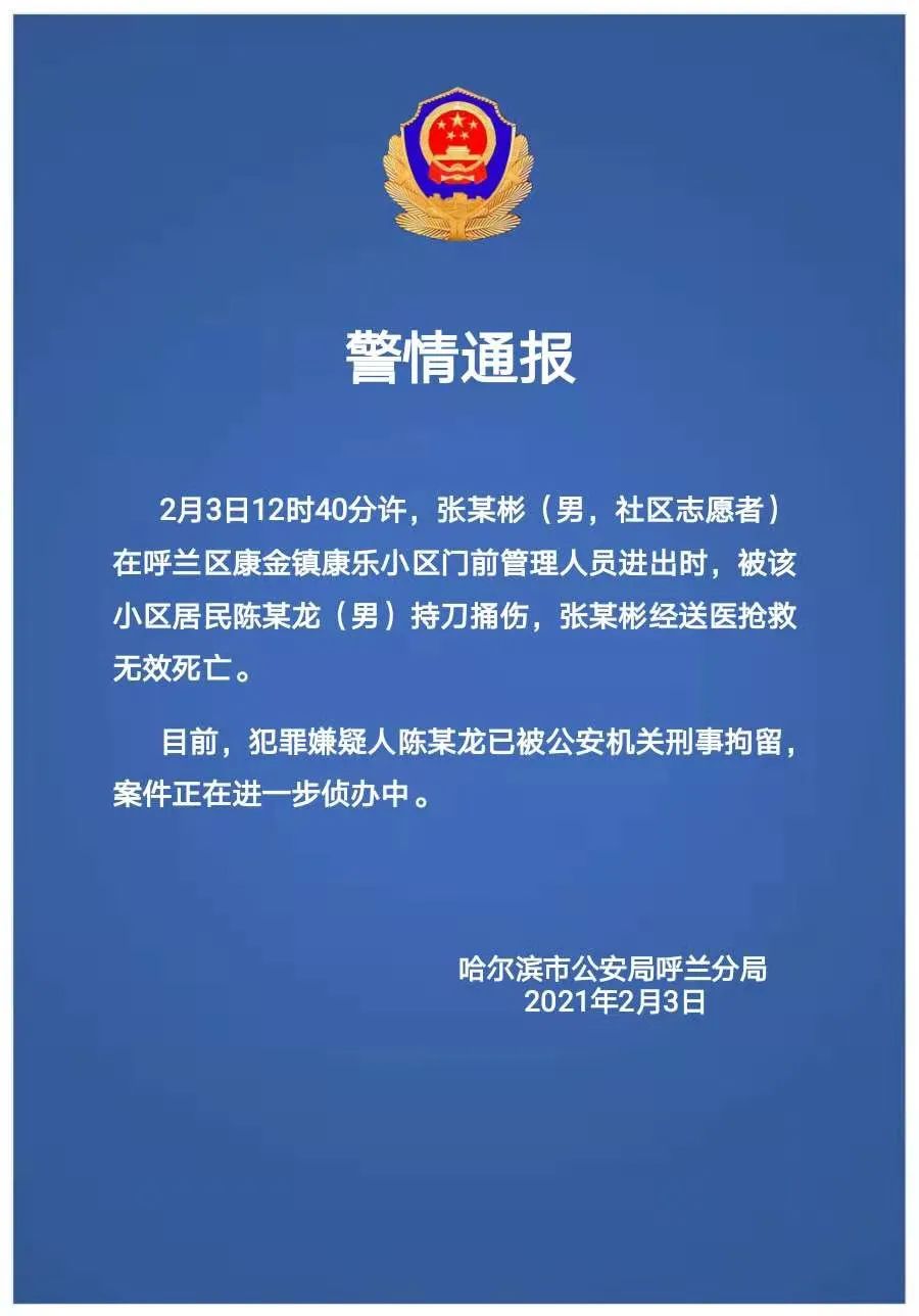 据黑龙江哈尔滨市公安局呼兰分局通报,昨天(2月3日)中午,呼兰区康金镇康乐小区门前管理人员张某彬(志愿者)管理人员进出时,被小区居民陈某龙持刀捅伤。张某彬经送医抢救无效死亡。嫌犯陈某龙已被刑拘,案件正在进一步侦办中。
