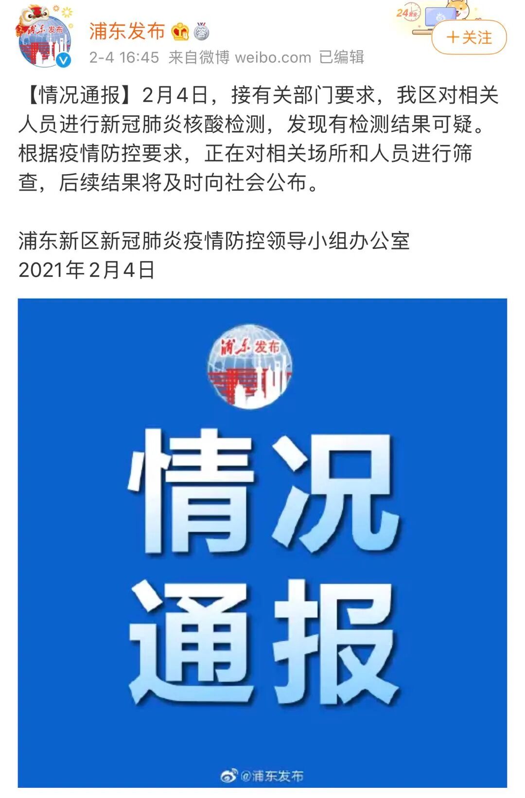 今日(4日)下午4时许,上海市浦东新区人民政府新闻办公室官方微博@浦东发布 发布一则情况通报。