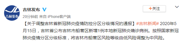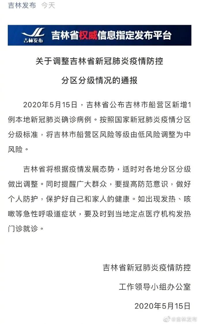 今天早上9时许,据@吉林发布 2020年5月15日,吉林省公布吉林市船营区新增1例本地新冠肺炎确诊病例。按照国家新冠肺炎疫情分区分级标准,将吉林市船营区风险等级由低风险调整为中风险。