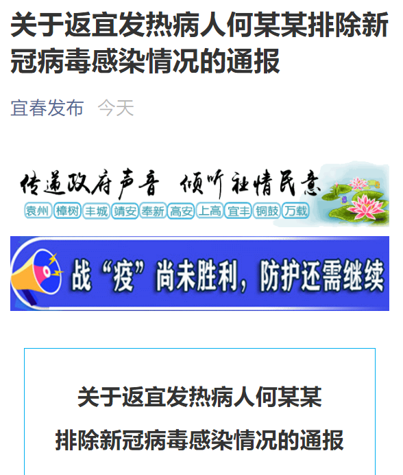 昨天(2月13日),江西省宜春市新冠肺炎疫情防控应急指挥部办公室发布“关于返宜发热病人何某某排除新冠病毒感染情况的通报”:
