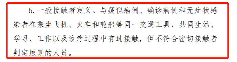 据《新型冠状病毒肺炎防控方案 (第七版)》,一般接触者定义为:与疑似病例、确诊病例和无症状感染者在乘坐飞机、火车和轮船等同一交通工具、共同生活、 学习、工作以及诊疗过程中有过接触,但不符合密切接触者判定原则的人员。