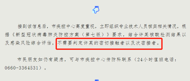 接到该信息后,市疾控中心高度重视,立即组织专业技术人员核实相关情况,根据《新型冠状病毒肺炎防控方案(第七版)》要求,结合许某核酸检测结果以及感染风险综合评估,不需要判定许某的密切接触者以及次密接者。