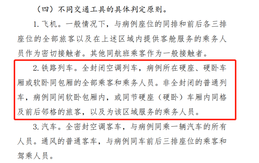 铁路列车对“一般接触者”的具体判定原则为:全封闭空调列车,病例所在硬座、硬卧车厢或软卧同包厢的全部乘客和乘务人员。非全封闭的普通列车,病例同间软卧包厢内,或同节硬座(硬卧)车厢内同格及前后邻格的旅客,以及为该区域服务的乘务人员。