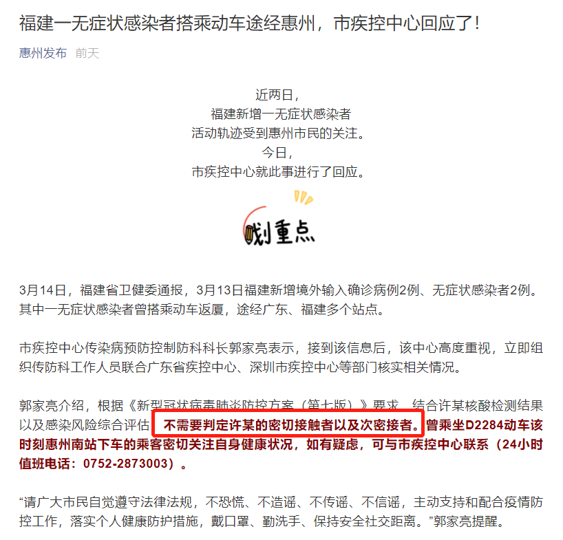 南都君从微信公众号“惠州发布”和“汕尾市疾病预防控制中心”获悉,3月16日、3月17日,惠州市疾控中心和汕尾市疾控中心分别就此事进行了回应。