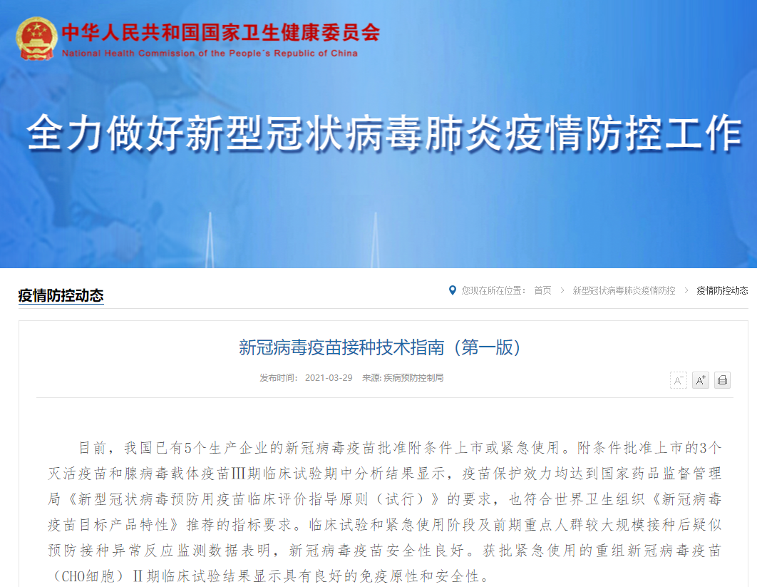 前天(3月29日),国家卫健委正式发布《新冠病毒疫苗接种技术指南(第一版)》,就疫苗种类、推荐免疫程序、有关事项、特定人群接种建议等疫苗接种相关事宜作出说明。