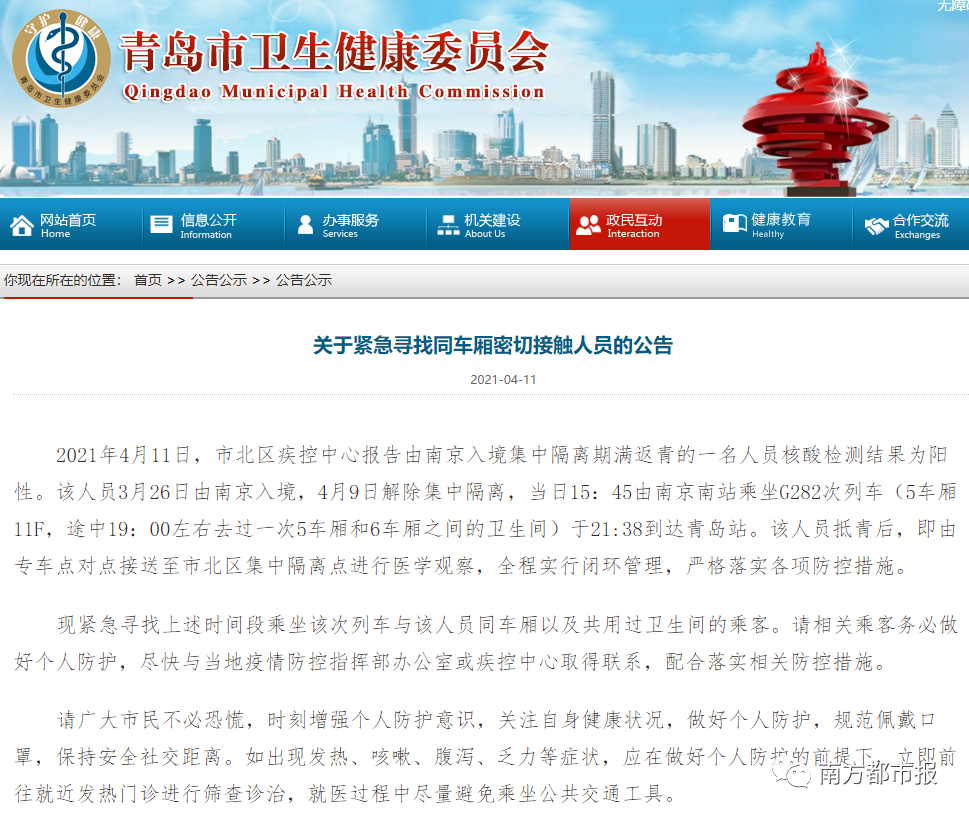 新增境外输入确诊病例张某,男,38岁,中国籍,青岛人,在意大利工作。2021年3月26日由意大利米兰乘坐飞机抵达南京,在南京集中隔离医学观察14天,期间核酸和血清抗体检测结果均为阴性。2021年4月9日在南京解除集中隔离后,由南京南站乘坐G282次列车于当日21:38抵达青岛站,由转运专车点对点接至市北区集中隔离点进行医学观察。4月11日市北区疾控中心核酸检测结果阳性,转至定点医院隔离观察,结合流行病学史、临床表现和实验室检测结果,专家组诊断为新冠肺炎确诊病例(普通型),目前在定点医院隔离治疗。已追踪到其密切接触者60人,均已实施集中隔离医学观察。