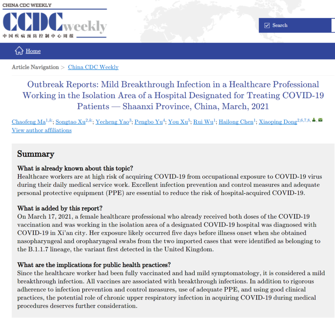 4月20日,《中国疾病预防控制中心周报》在线发表了陕西西安市一名医院检验人员在已接受了两剂COVID-19疫苗后,仍感染新冠病毒的调查报告。原因是她在发病前5天可能暴露于携带有在英国发现的变异病毒环境条件中。