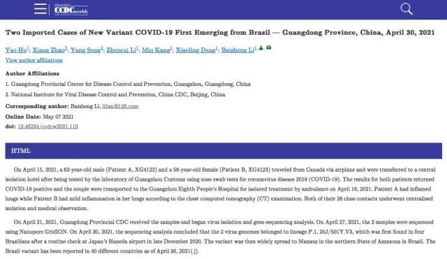 文章称,4月21日,广东省疾控中心收到样本后进行病毒分离和基因测序分析。4月30日,测序分析结论显示,这2个病毒基因组属于谱系P.1, 20J/501Y.V3,即2020年底首次在日本报告发现的巴西突变株。