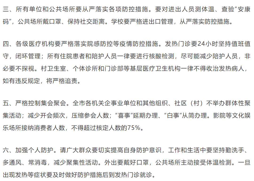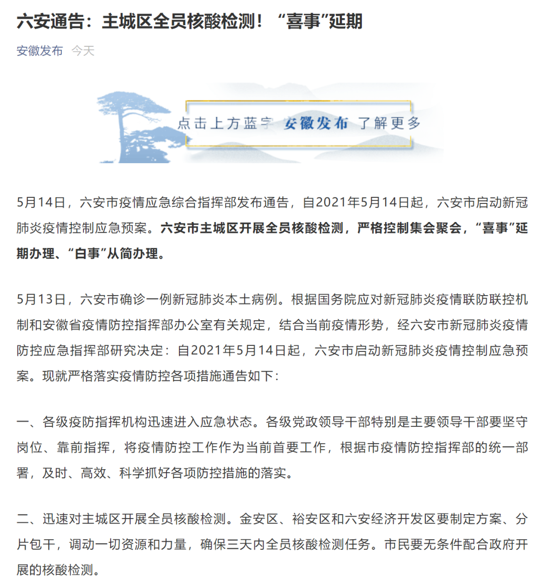 今天(5月14日),六安市疫情应急综合指挥部发布通告,自2021年5月14日起,六安市启动新冠肺炎疫情控制应急预案。六安市主城区开展全员核酸检测,严格控制集会聚会,全市各机关企事业单位和其他组织、社区(村)不举办群体性聚集活动;减少开会频次,压缩参会人数;“喜事”延期办理、“白事”从简办理。影院等文化娱乐场所接纳消费者人数,不得超过核定人数的75%。