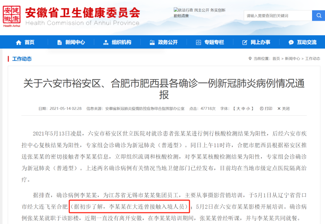 今天(14日)上午,辽宁大连市疾控中心发布紧急通告称:“安徽病例在连期间目前排查无入境人员接触史”。