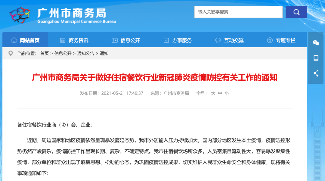 21日下午,广州市商务局官网关于做好住宿餐饮行业新冠肺炎疫情防控有关工作的通知。通知中提醒各住宿餐饮行业商(协)会、企业,要发动从业人员做好疫苗接种,与此同时,通知称,餐饮企业接待家庭私人聚会聚餐一般控制在 10 人以下。