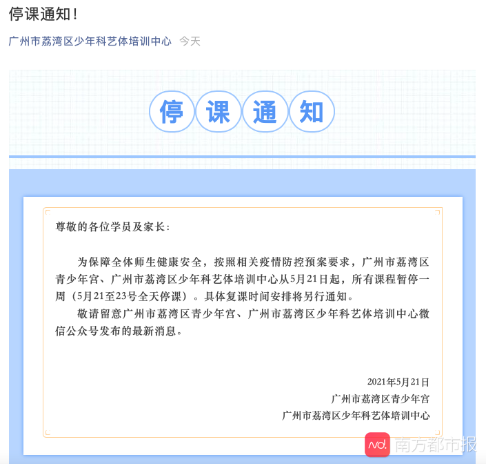 今日(21日),南都记者从广州市荔湾区少年科艺体培训中心获悉,为保障全体师生健康安全,按照相关疫情防控预案要求,广州市荔湾区青少年宫、广州市荔湾区少年科艺体培训中心从5月21日起,所有课程暂停一周(5月21至23号全天停课)。具体复课时间安排将另行通知。