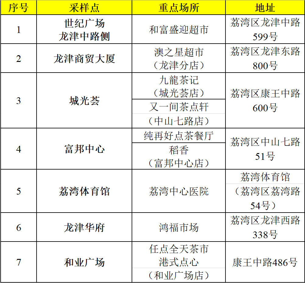 为全面落实疫情防控工作,确保市民的健康安全,请5月15日至21日到过任点全天茶市港式点心(和业广场店)、和富盛迎超市、纯再好点茶餐厅、澳之星超市(龙津分店)、稻香(富邦中心店)、九龍茶记(城光荟店)、又一间茶点轩(中山七路店)、鸿福市场、荔湾中心医院等重点场所的市民群众,尽快携带手机和身份证,做好个人防护,就近到以下采样点进行第二次核酸检测。