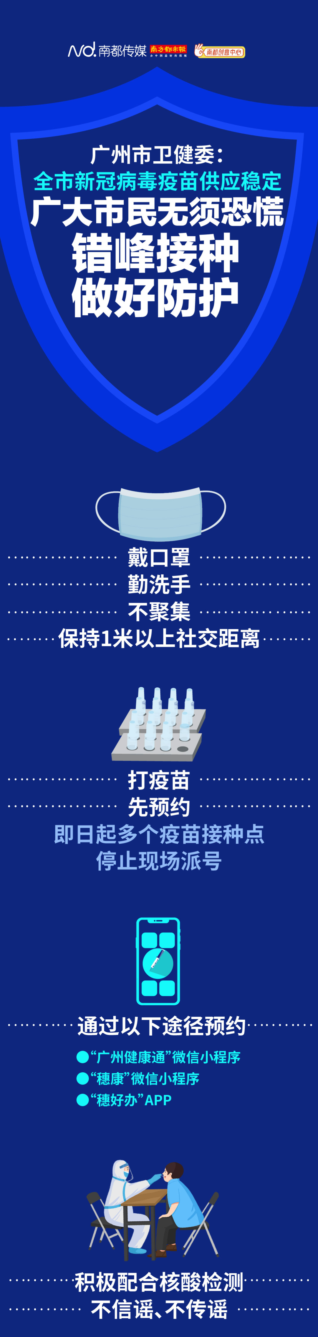 近日,广州市民接种新冠病毒疫苗的意愿持续高涨,多个接种点现场大排长龙,关于疫苗接种的多种说法也在网上流传。昨日(5月26日),南都记者从广州市卫健委获悉,当前全市新冠病毒疫苗供应稳定,可满足近远期群众接种需要。广大市民无须恐慌,请通过线上预约,合理安排时间、错峰接种,同时全程做好个人防护。