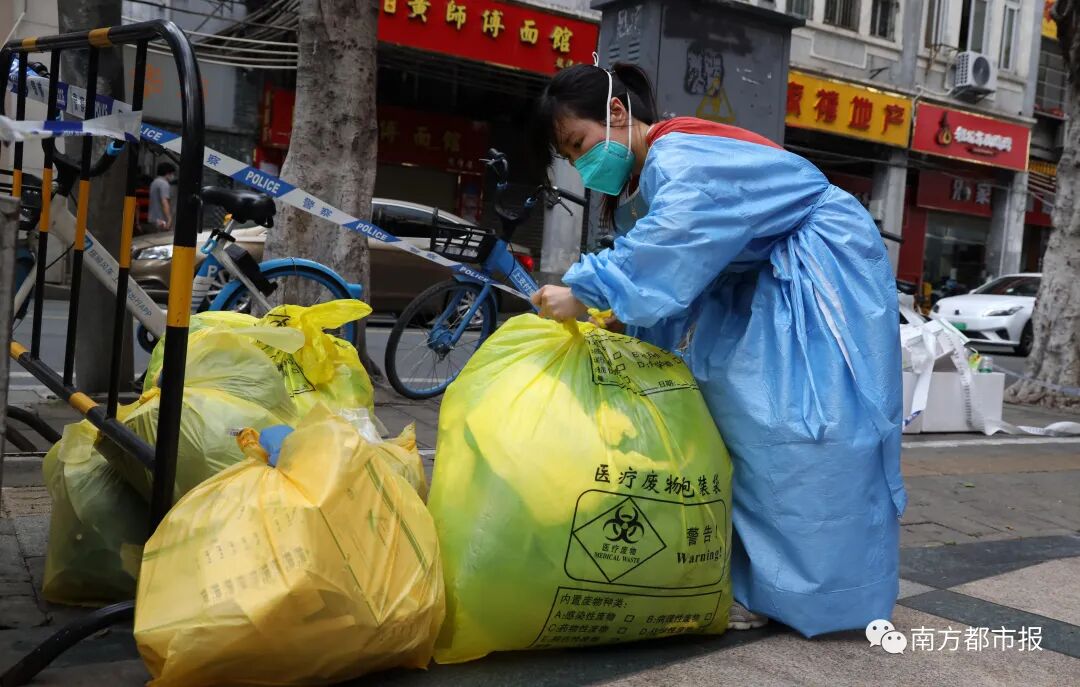 5月27日,荔湾和业广场核酸检测点工作人员在打包医疗废物。南都记者 冯宙锋 摄