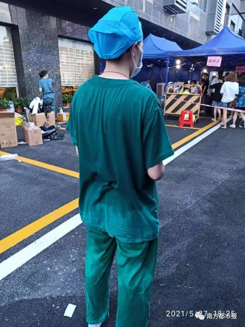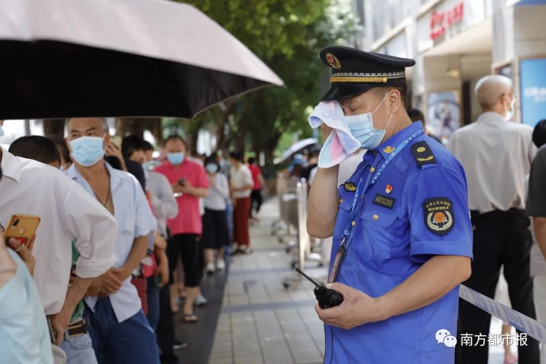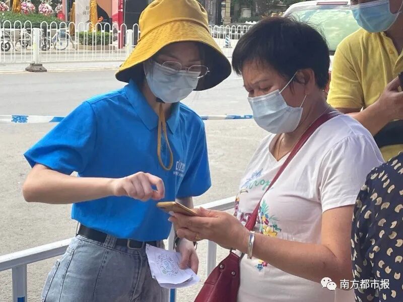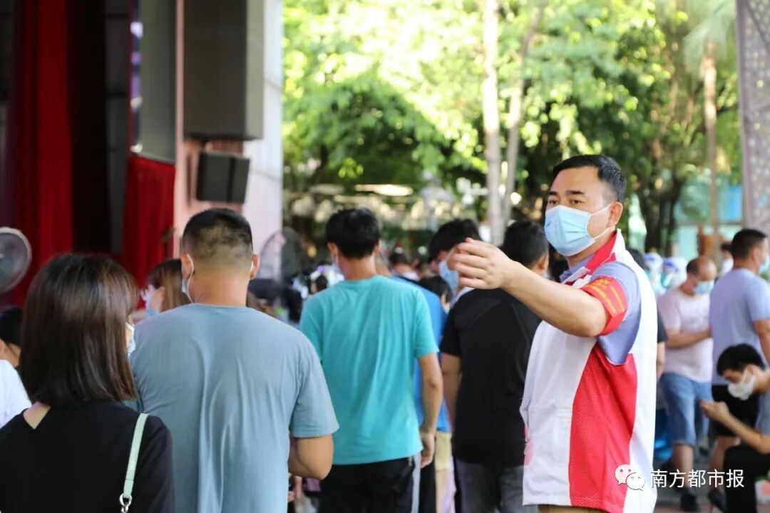 64岁的陈先生是海珠区素社街道海印南社区居民,做完检测之后,他留在现场维持了2小时左右的秩序,他一直说“闲着没事找点事做”。南都记者 何玉帅 摄