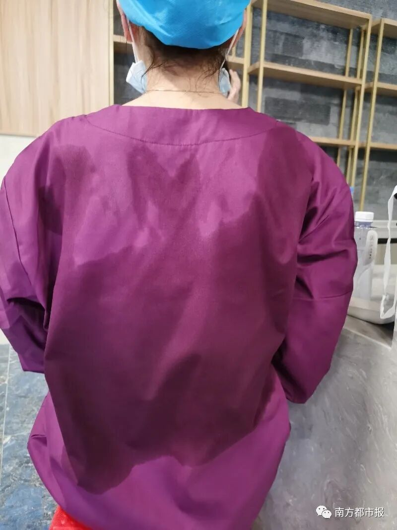 5月27日,荔湾和业广场核酸检测点,医护人员帮同事掀开防护服擦拭汗水。南都记者 冯宙锋 摄