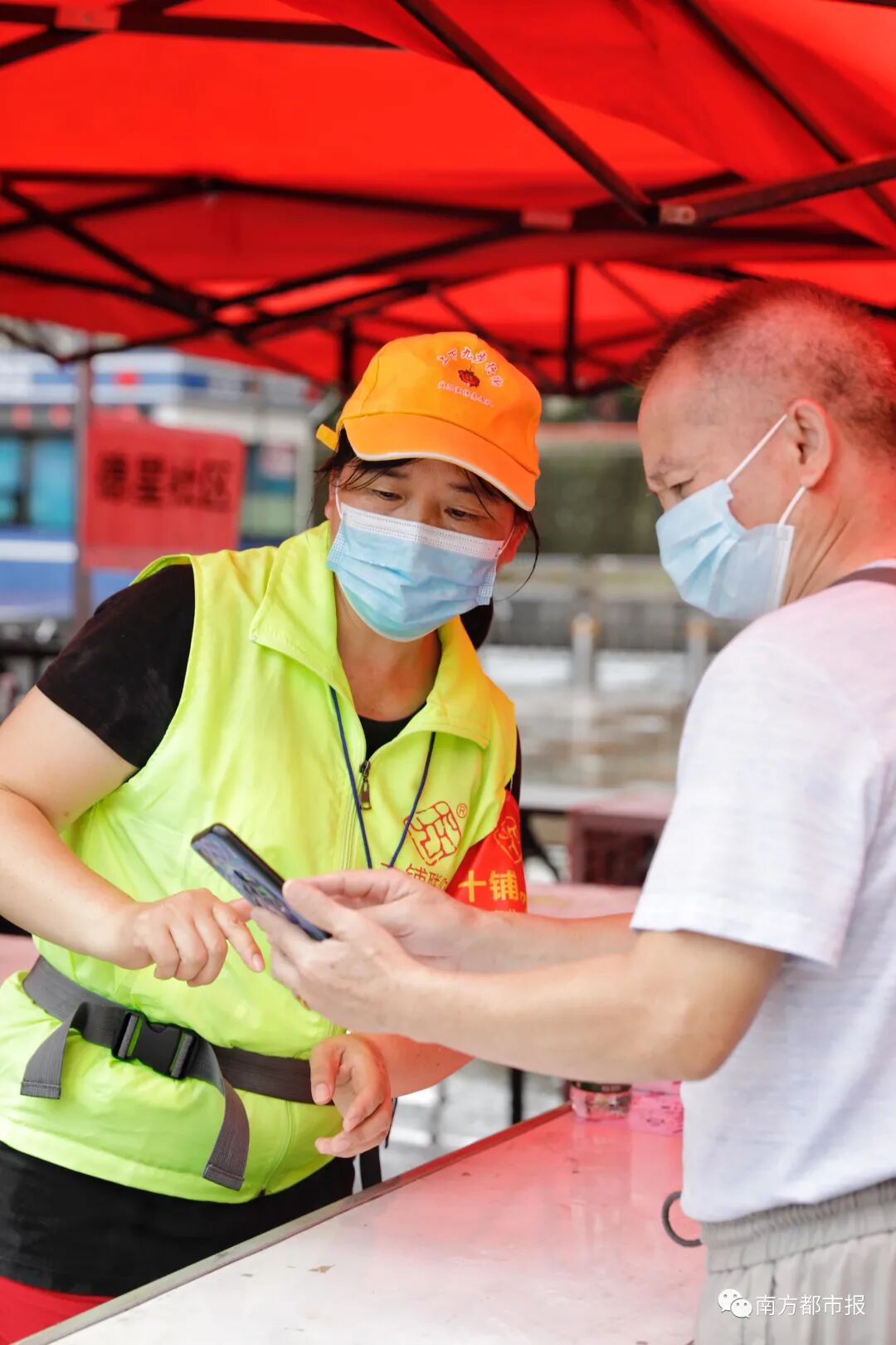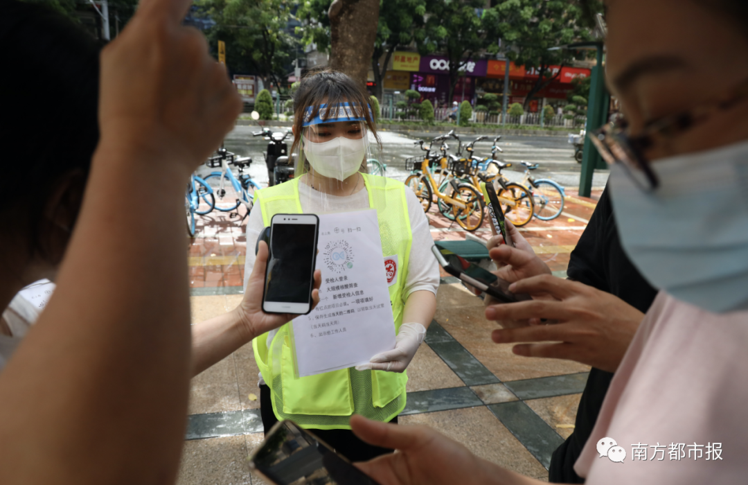 5月28日中午,社工小陈在荔湾社区东漖街帮市民登记健康码信息。
